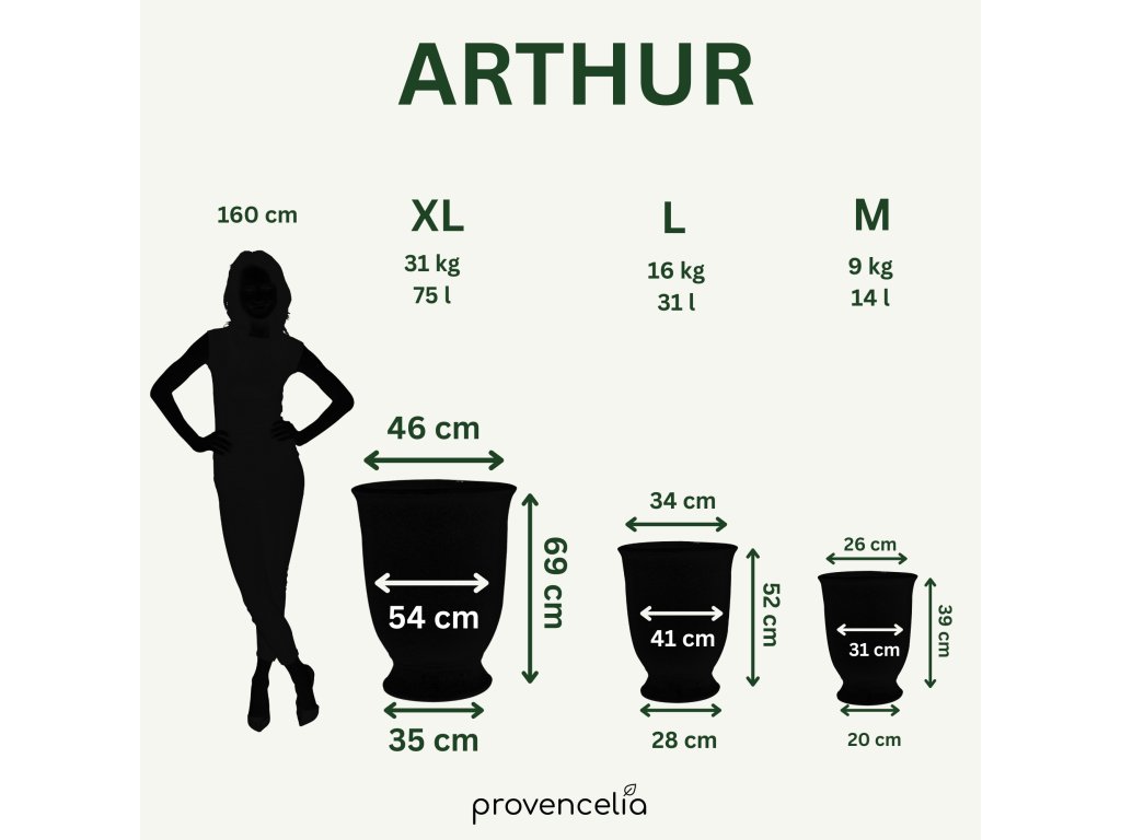 Obohaťte svoju záhradu o nadčasový štýl s ručne vyrábaným kvetináčom Arthur. Tento kvetináč, inšpirovaný tradičným štýlom Anduze, je starostlivo vytvorený z glazovanej terakoty, ktorá je odolná voči mrazu a poveternostným vplyvom. Na výber máte z niekoľkých veľkostí - od M až po XL s výškou 69 cm a priemerom 55 cm vyniká svojou tyrkysovou farbou a čistým dizajnom, ktorý podčiarkujú čistotu a jednoduchosť. Kvetináč Arthur je vhodný na vonkajšie aj vnútorné použitie, s otvorom v dne pre prirodzený odtok prebytočnej vody. Každý kus je ručne vyrábaný, čo z neho robí jedinečný a autentický doplnok vášho vonkajšieho priestoru. Vďaka svojej kvalitnej konštrukcii a nadčasovému designu je tiež skvelým darčekom pre zvláštne príležitosti.
