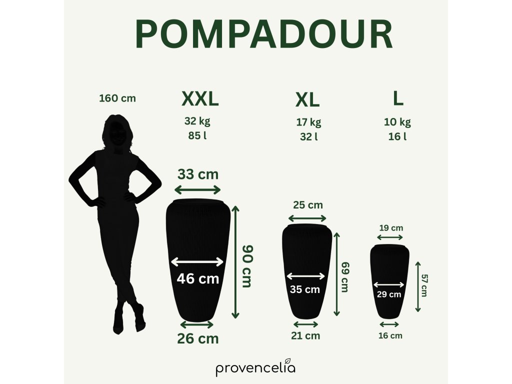 Obohaťte svoju záhradu o nadčasový štýl s ručne vyrábaným kvetináčom Pompadour. Tento kvetináč, inšpirovaný tradičným štýlom Anduze, je starostlivo vytvorený z glazovanej terakoty, ktorá je odolná voči mrazu a poveternostným vplyvom. Na výber máte z niekoľkých veľkostí - od L až po XXL s výškou až 68 cm vyniká svojou nádhernou farbou a čistým designom ktorým podčiarkuje čistotu a jednoduchosť tohto kvetináča. Kvetináč Pompadour je vhodný na vonkajšie aj vnútorné použitie, s otvorom na dne pre prirodzený odtok prebytočnej vody. Každý kus je ručne vyrábaný, čo z neho robí jedinečný a autentický doplnok vášho vonkajšieho priestoru. Vďaka svojej kvalitnej konštrukcii a nadčasovému designu je tiež skvelým darčekom pre zvláštne príležitosti.